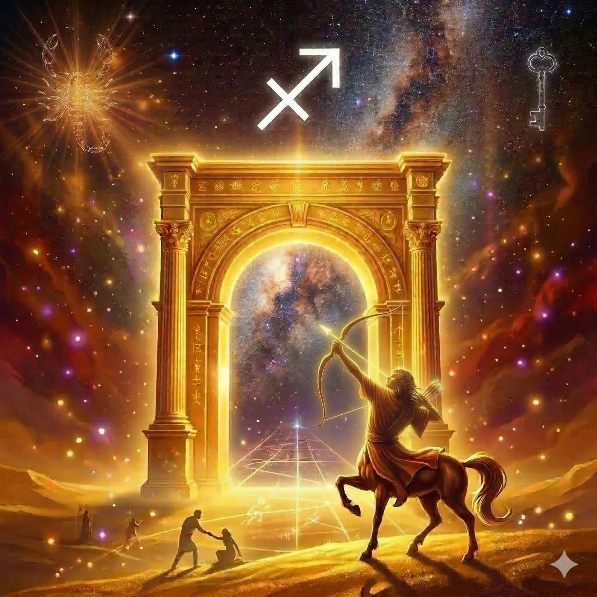 A Lélek, maga mögött hagyva a Skorpió sötét, transzformáló örvényeit, egy végtelennek tűnő, aranyló fennsíkra érkezett. A levegő itt forró volt és bizsergető, tele a tágulás és a szabadság ígéretével. Elérkezett a Kilencedik Kapuhoz, a Nyilas vidékére, ahol a Tejút ezüstös sávja szinte karnyújtásnyira vibrált az égen.